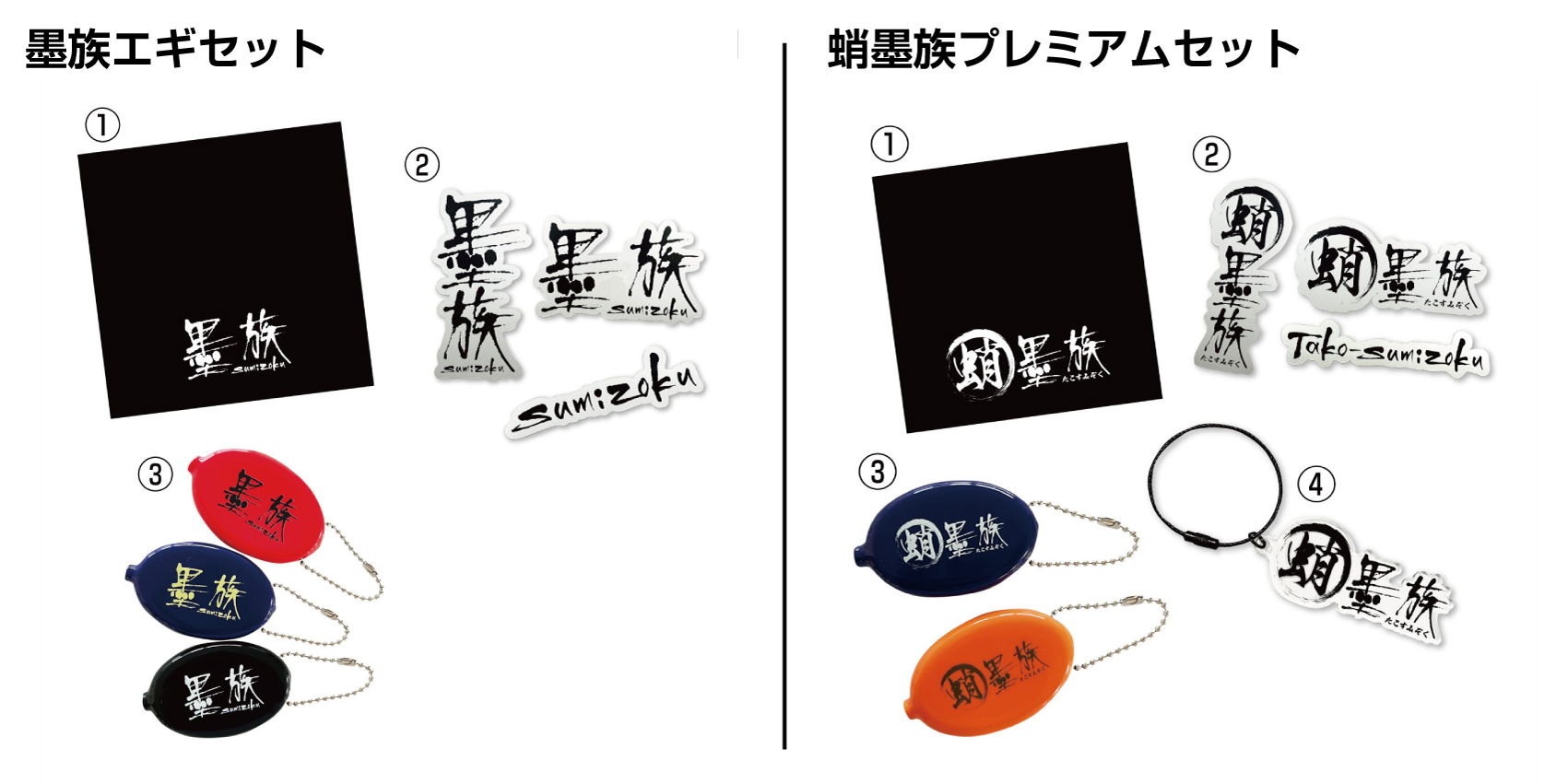 ①蛸墨族タオル ②蛸墨族ステッカー3種 ③蛸墨族エコケース(カラーランダム) ④蛸墨族キーホルダー |